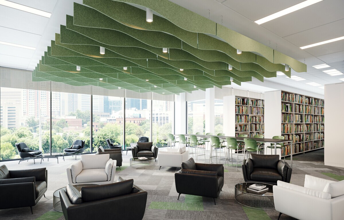 Felt Ceiling Baffle SystemCan be cut into virtually unlimited shapes, creating dramatic designs from soft waves to sloping angles