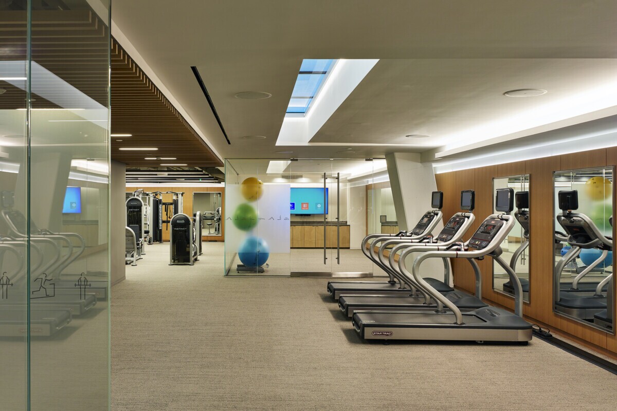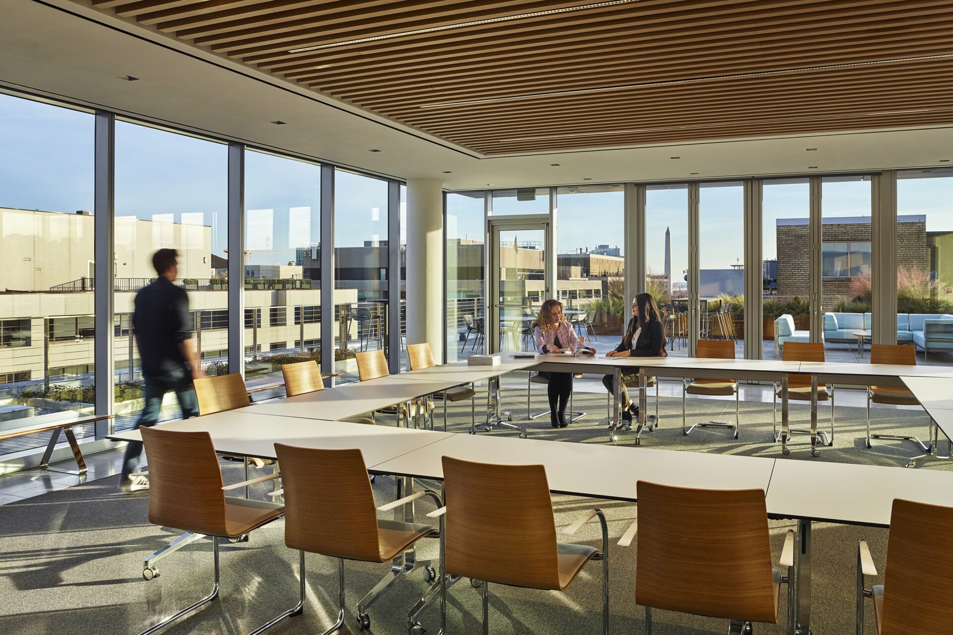 Maxxit worked with a global design and architecture firm on an iconic project located squarely in Washington D.C’s Central Business District. The project features our LINE:Form Traditional Extruded Baffles in a fitness center and a meeting room that opens up to a rooftop lounge with a dramatic view of the Washington Monument. The design intent for the space called for an elegant aesthetic with light-filled spaces. The baffles featured a realistic wood look finish that completed the look with the warm natural feel of wood in a clean linear design.