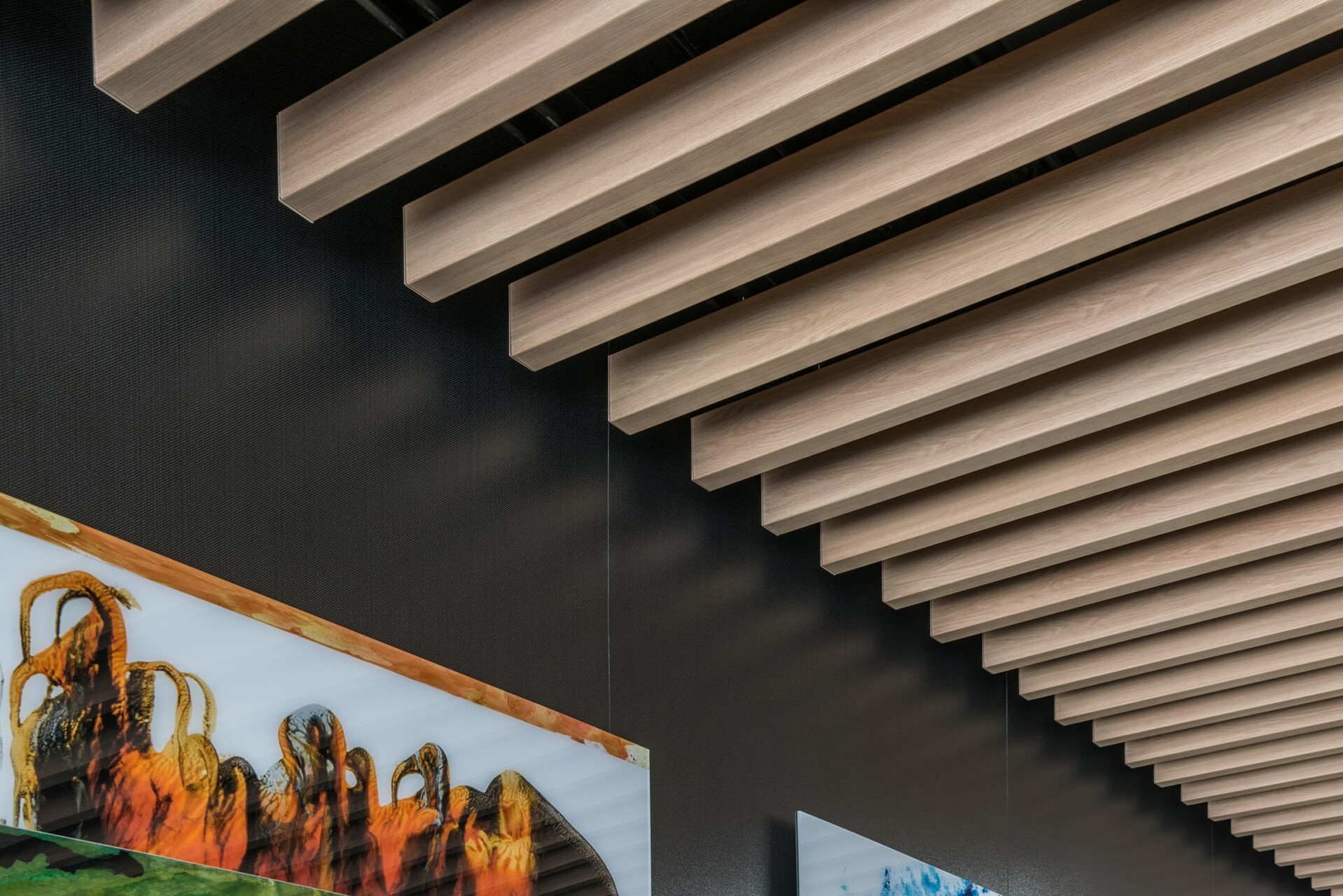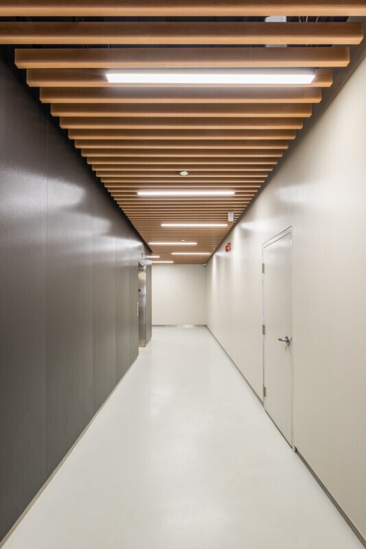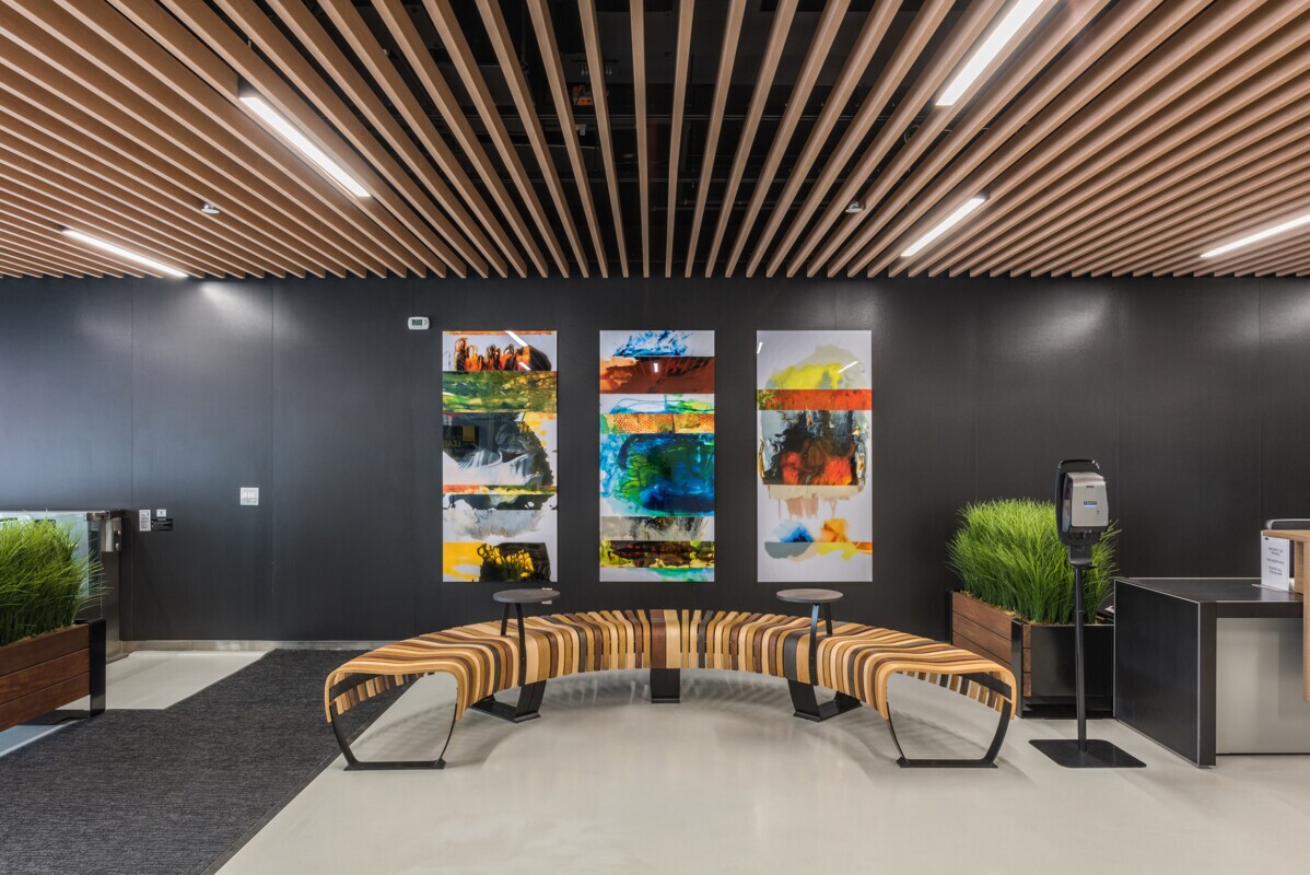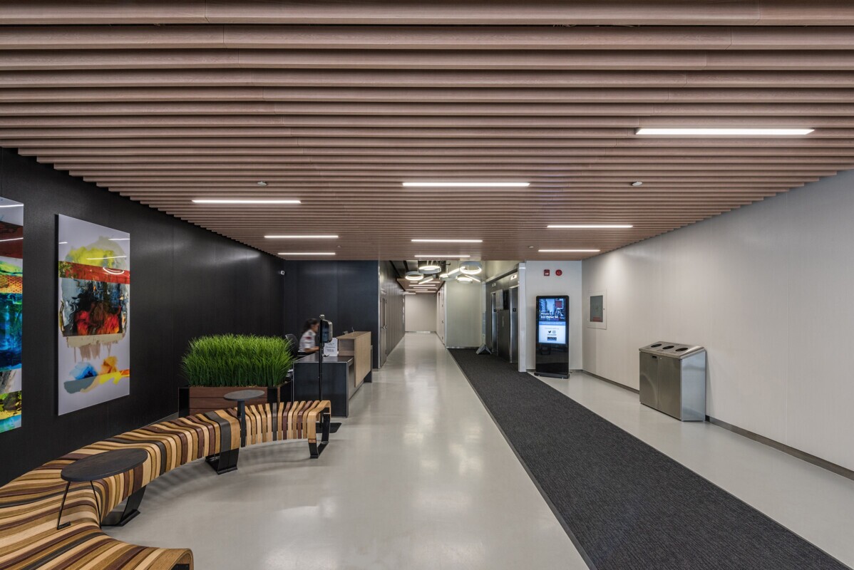 The finished product incorporated a woodgrain-infused coating. The ceiling baffles were created from aluminum, non-combustible lightweight materials. The look in the space is eye-catching with clean, straight lines.