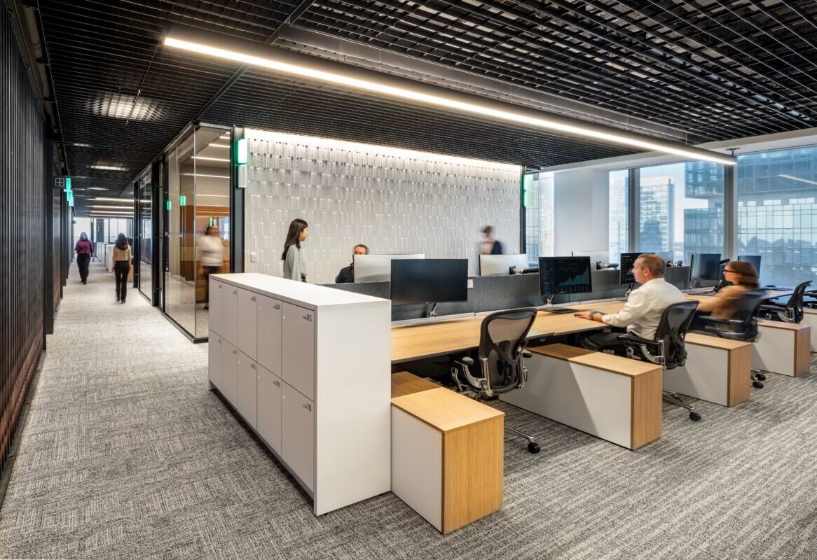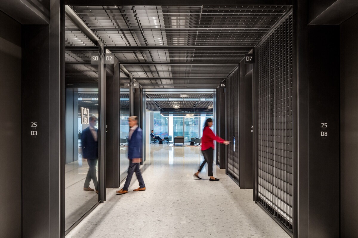 Maxxit collaborated closely with Gensler and Eurotech Construction to develop a custom industrial-inspired AERO:Form Grille Open Cell system, tailored to meet the demands of a dynamic, modern workplace. Comprising sleek modular panels finished in a striking high-gloss “Forged Charcoal” metallic paint, the system offers seamless integration with lighting, ventilation, and life-safety infrastructure, without compromising design intent.
