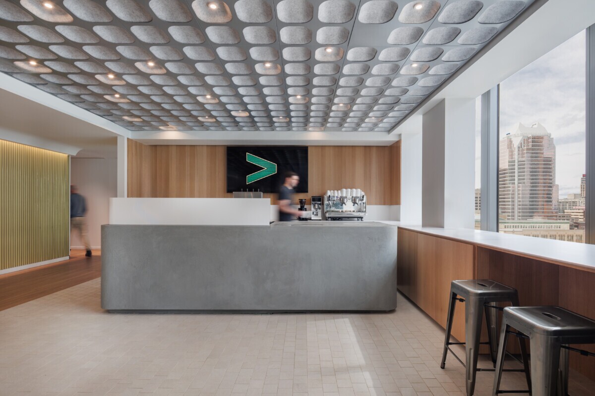 A key component of the ceiling panels is the 3/8″ felt backing which provides exceptional sound-absorbing qualities. This feature ensures acoustic comfort for all occupants, supporting the design team’s vision to make the office environment conducive to innovation.