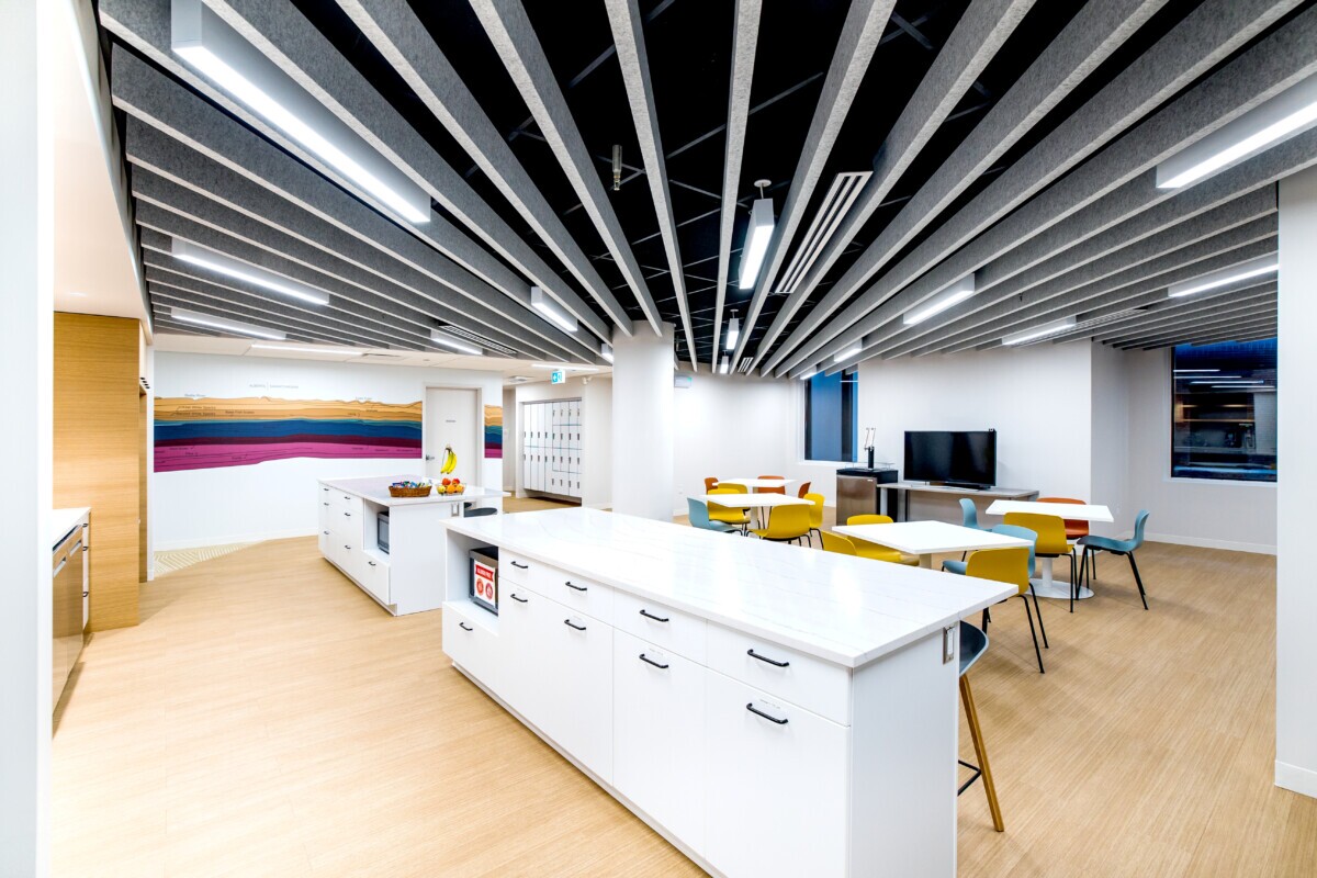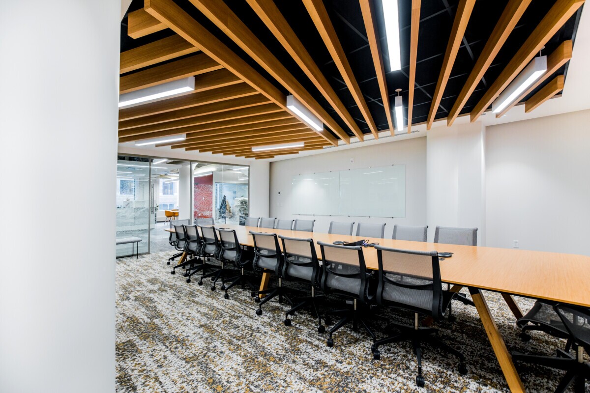 In the meeting room, LINE:Form Traditional Baffles featuring a perforated, woodgrain finish adorn the ceiling. These baffles effectively control noise levels, fostering a more conducive environment for productive discussions and collaboration among employees. Moreover, LINE:Form Traditional Baffles in felt profile grace the kitchen and common seating areas. Crafted from high-quality felt material, they mitigate sound reflection to enhance acoustic comfort for occupants.