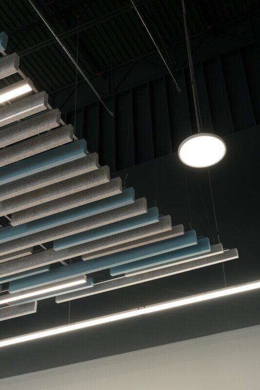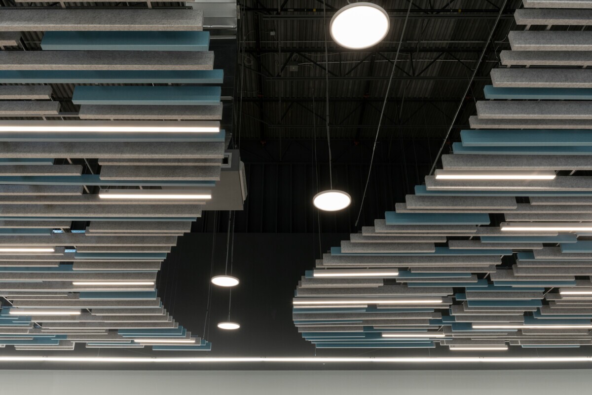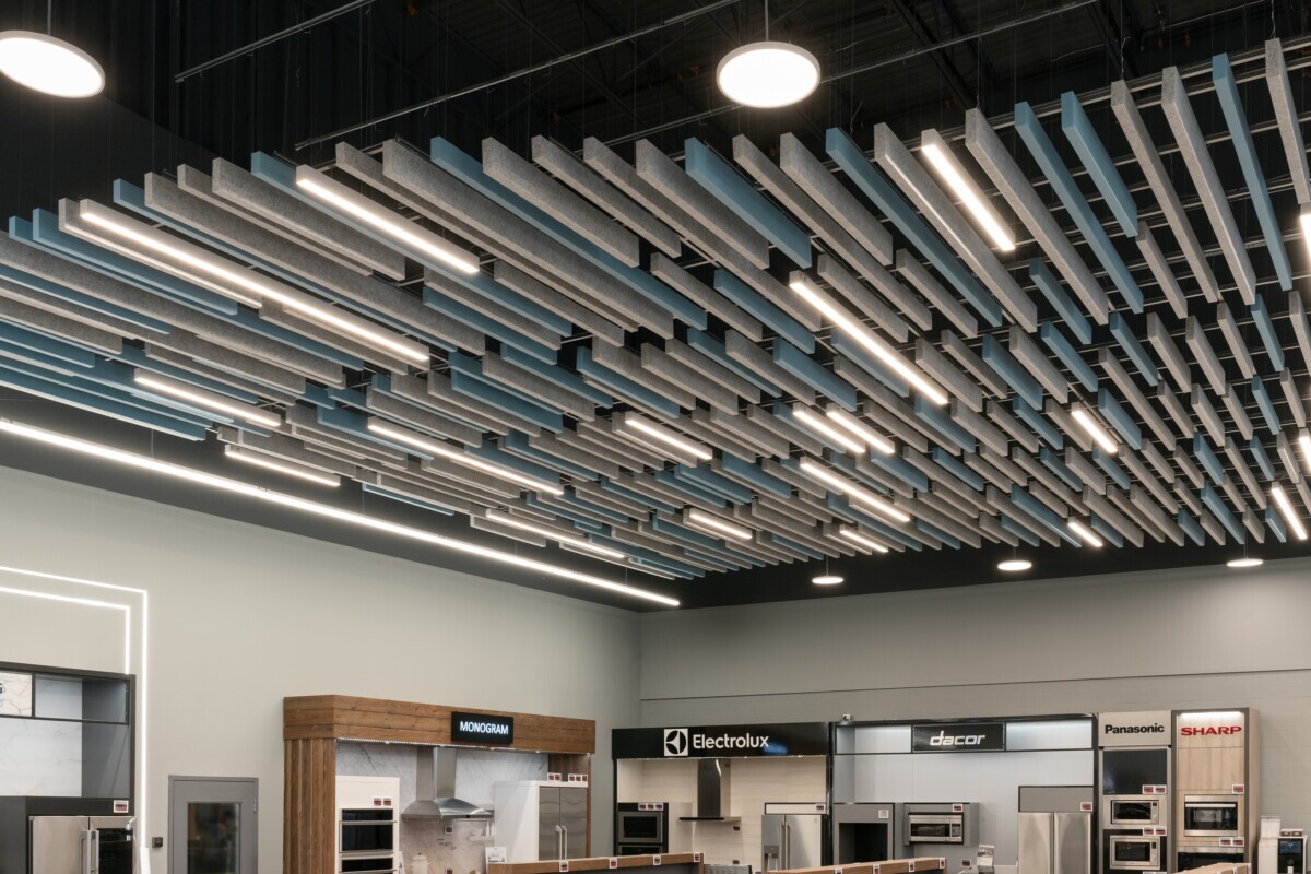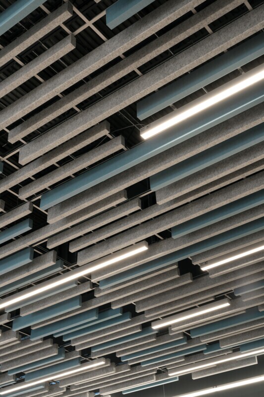 Spanning an impressive 200,000 square feet, our client sought a solution that enhances the visual appeal and addresses acoustic concerns inherent in their large, open retail space. Crafted from sound-absorbing felt, uniquely sized, and in multi-colour, the LINE:Form Elevations Baffles in felt profile with LED lights elevate the ambiance while effectively controlling noise levels for occupant comfort.
