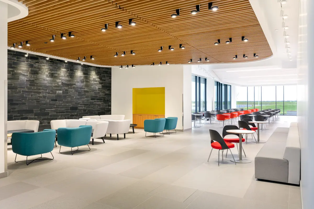 As the second-largest blood processing and distribution center, our client sought a ceiling solution that seamlessly integrates with their open space. Our LINE:Form Traditional Baffles are meticulously inset into the ceiling design to deliver a clean and sleek aesthetic. These baffles add a warm pop of color to the space which contrasts nicely with the modern, concrete white walls. Integrated lighting further enhances the ambiance. To stay in line with building standards, the baffles achieve LEED Gold certification that are compliant with the manufacturing processes. Moreover, the metal baffles can be cleaned easily and are resistant to dust accumulation, ensuring a perfect solution for a healthcare setting.