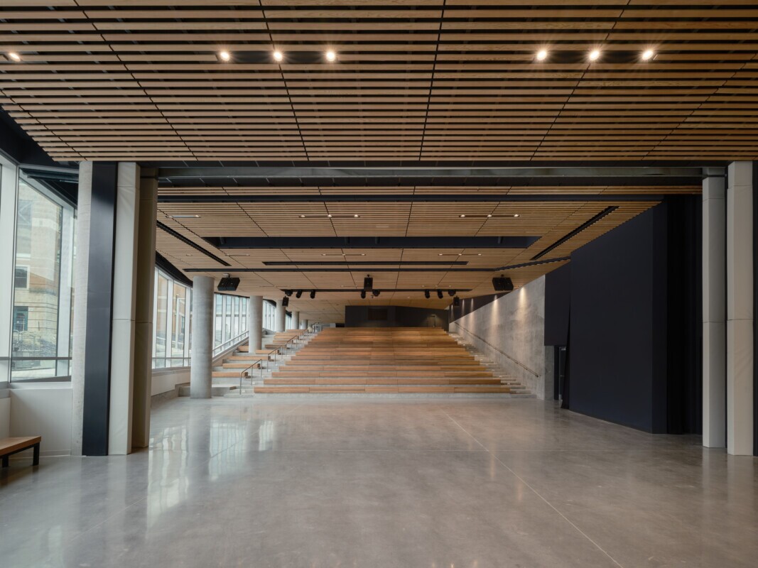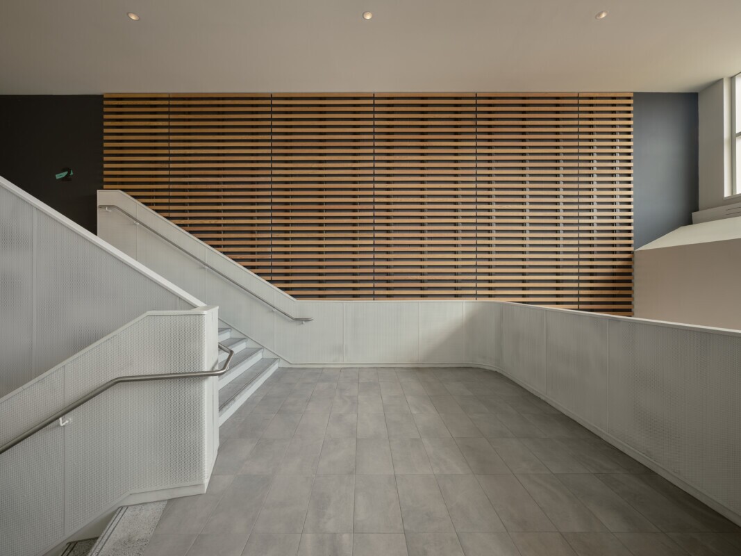For this project, we created custom wood Slats for the ceiling and walls. Wood was chosen for its biophilic properties, offering an abundance of timber to create a warm and inviting atmosphere. The result is a welcoming, natural, and inviting learning environment for the students. Additionally, lighting, fire, and audio systems were seamlessly integrated into the ceiling slat design, providing a clean and complementary finish. In the open space, the linear design of the slats guides the eye forward and serves as a subtle wayfinding aid for students.