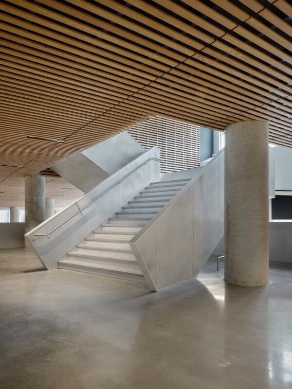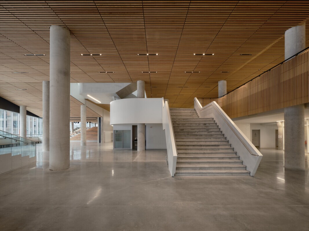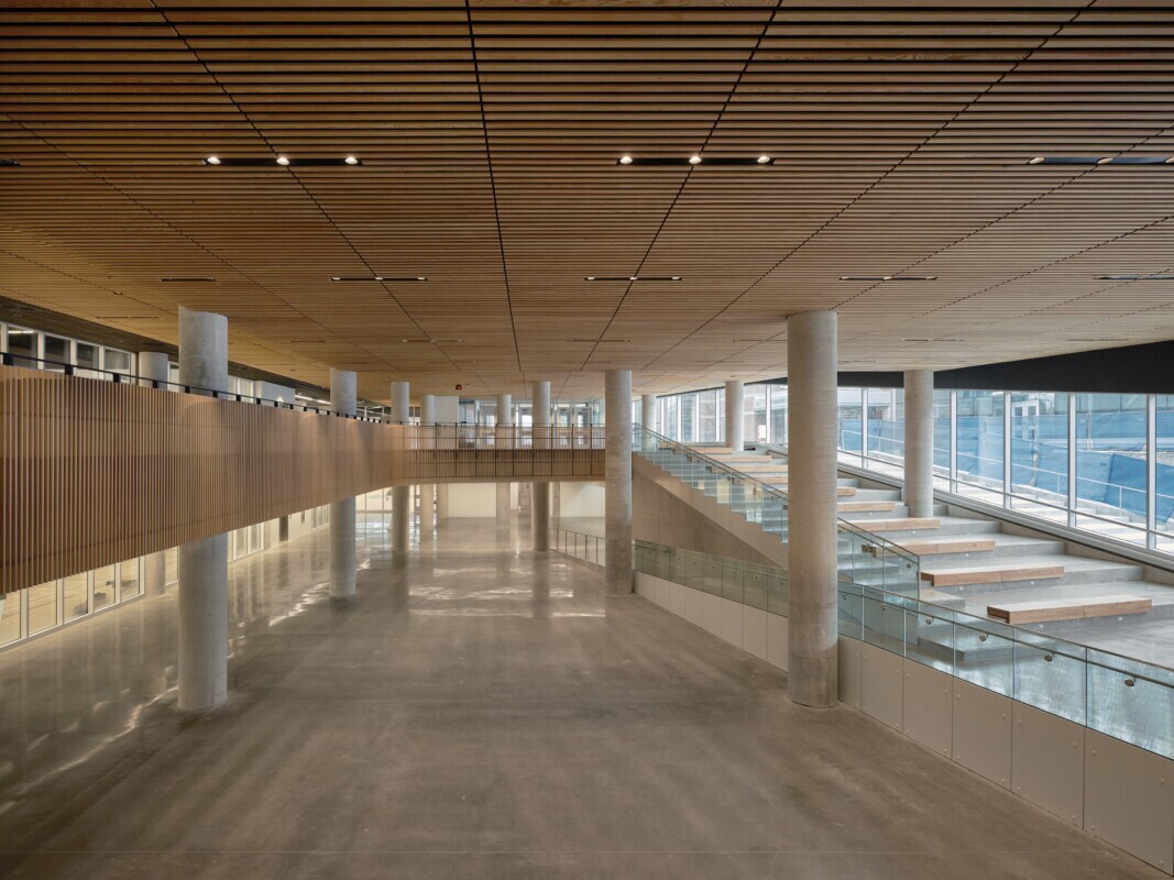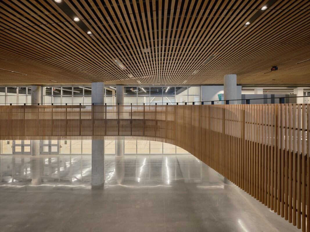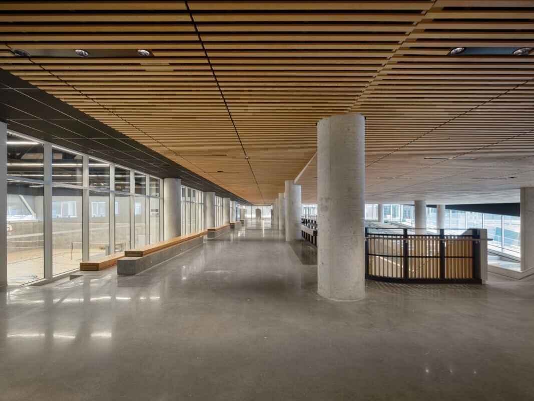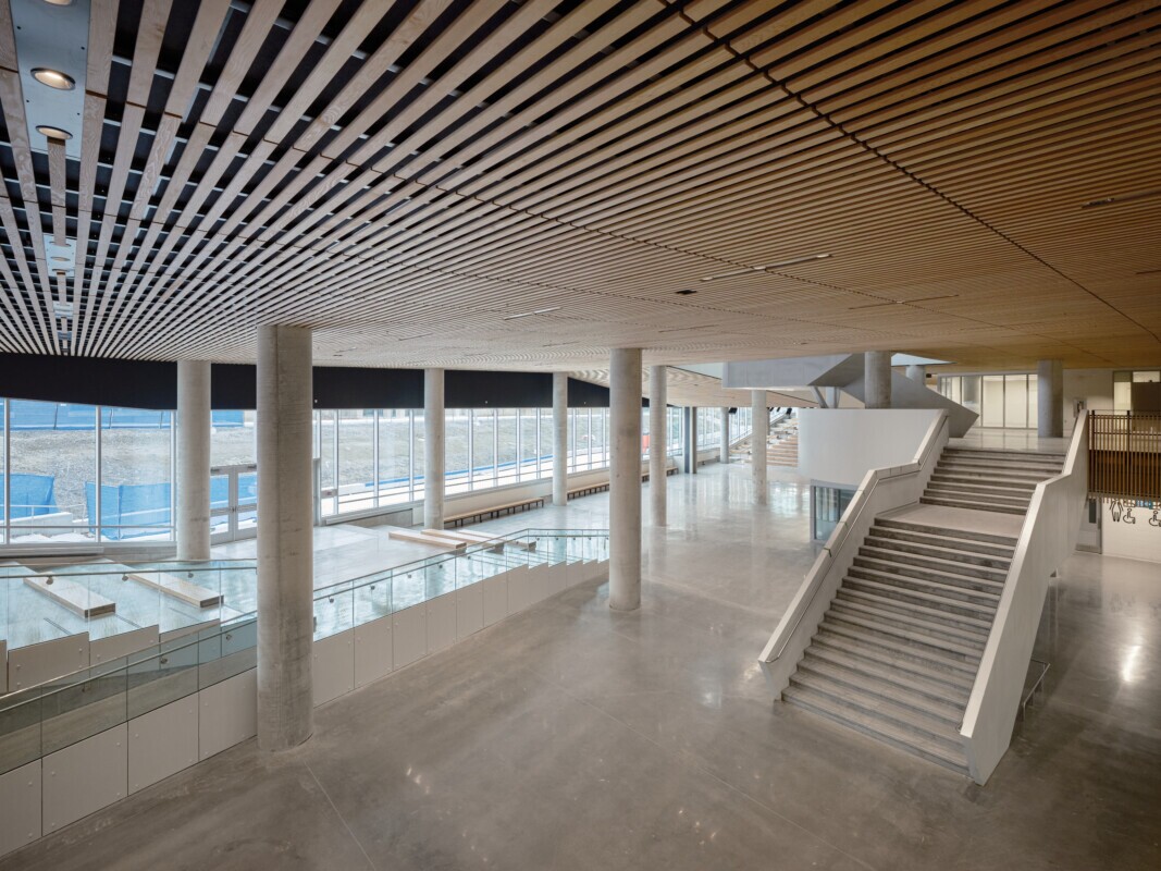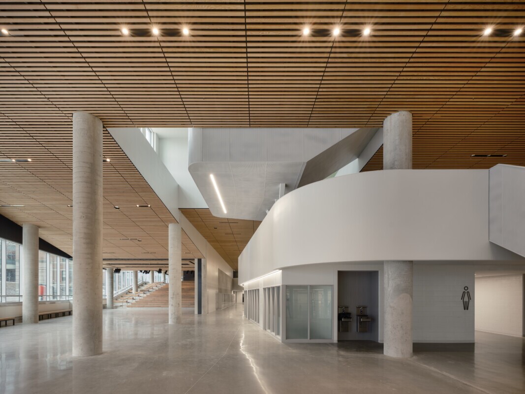 We collaborated with Groupe Piche and Lemay on the Chambly Secondary School project to deliver a transformative ceiling solution to support the school’s evolution into a hub of learning and collaboration for students and the surrounding community. The school’s design is characterized by natural hues, abundant sunlight, surrounding greenery, and a versatile open space that encompasses the cafeteria, bleachers, and an open auditorium.