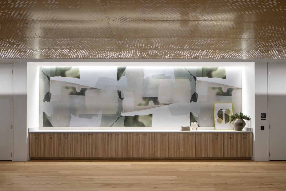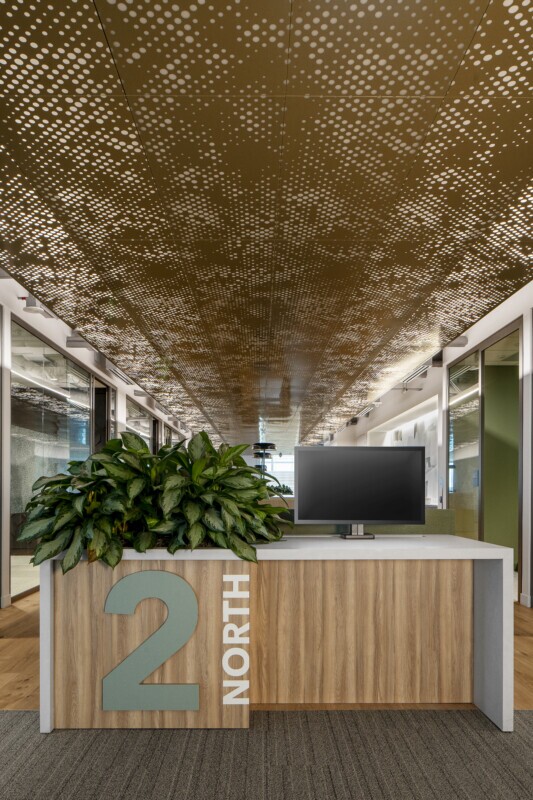 On the second floor, a striking PANEL:Form Design Perforated Ceiling Panels installation enhances the corridor with a sophisticated metallic powder-coated finish. The high-gloss appearance, coupled with LED backlighting, delivers a sleek and modern aesthetic while ensuring high energy efficiency.