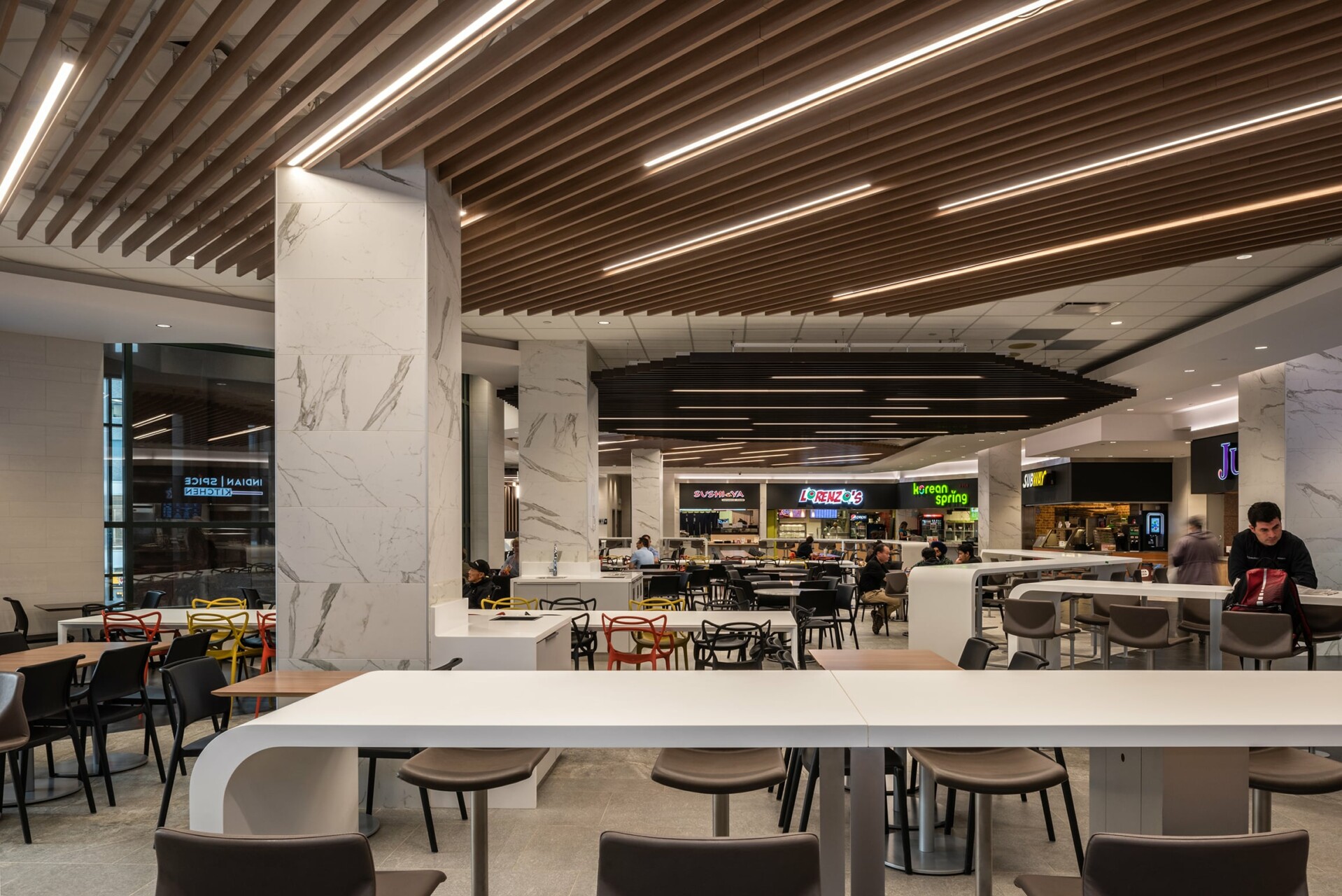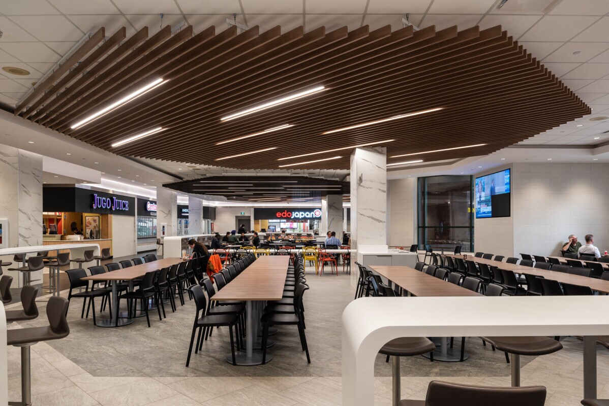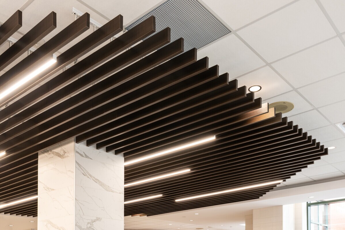 Commerce Place Food hall used our LINE:Form Traditional Baffles in custom wood finish. The baffles were finished in two specialty laminates, which matched surrounding wall features and millwork. Soffit T-bar fittings were utilized to simplify installation, mounting easily to the ceiling grid.