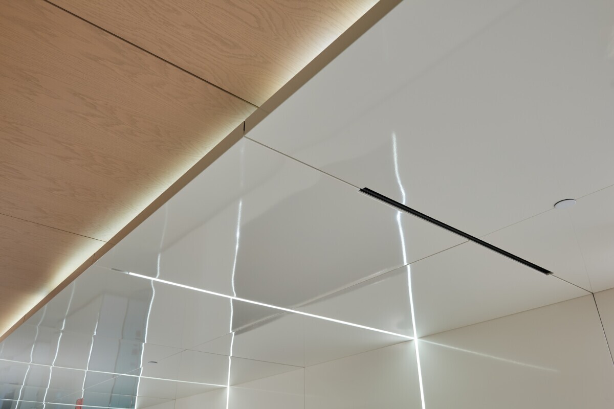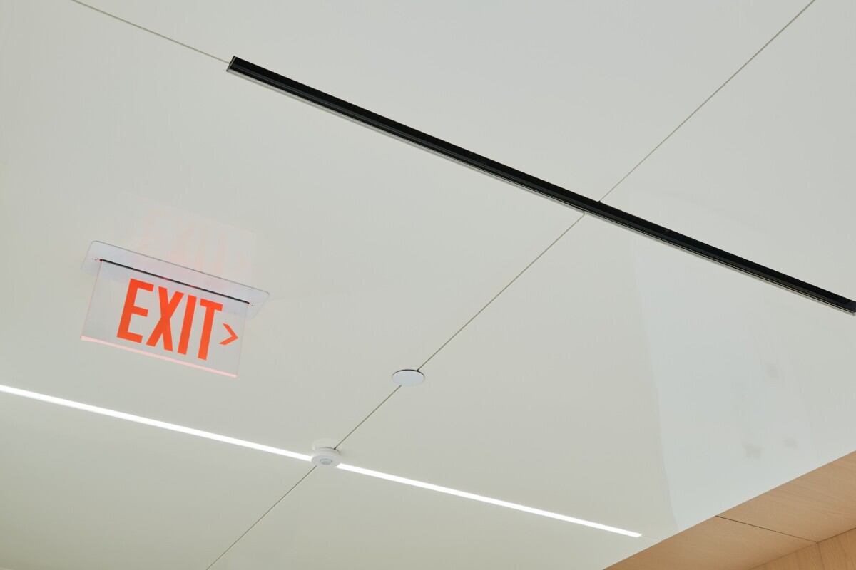 Using our PANEL:Form Traditional Ceiling Panels, we created a custom ceiling that met the client’s specifications and aesthetic requirements. Each panel is crafted with cutouts to integrate with the linear lighting, emergency signs and sprinkler system seamlessly. One panel edge was custom bent to provide a smooth transition to the light cove.