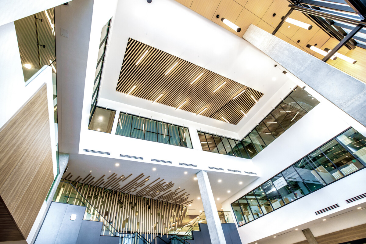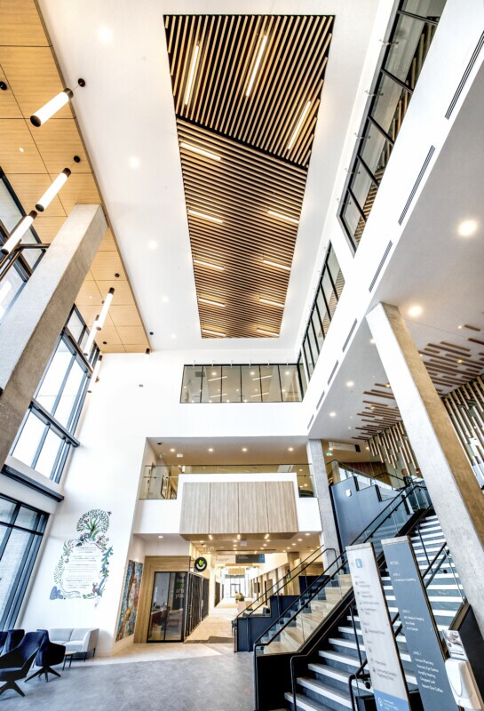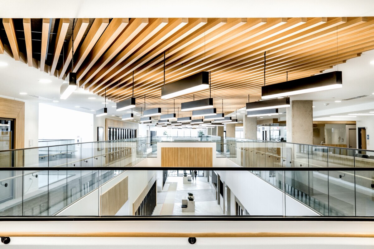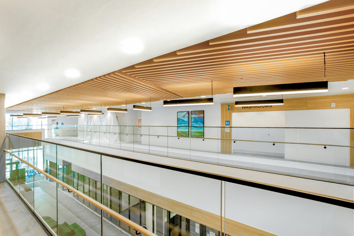 To complement the atrium’s openness, Maxxit delivered LINE:Form Traditional Baffles finished in Champagne Pine laminated film. The ceiling system features integrated linear lighting and a unique directional layout where the baffles shift orientation along the corridors. The lighting follows this shift, creating a dynamic interplay between form and illumination.