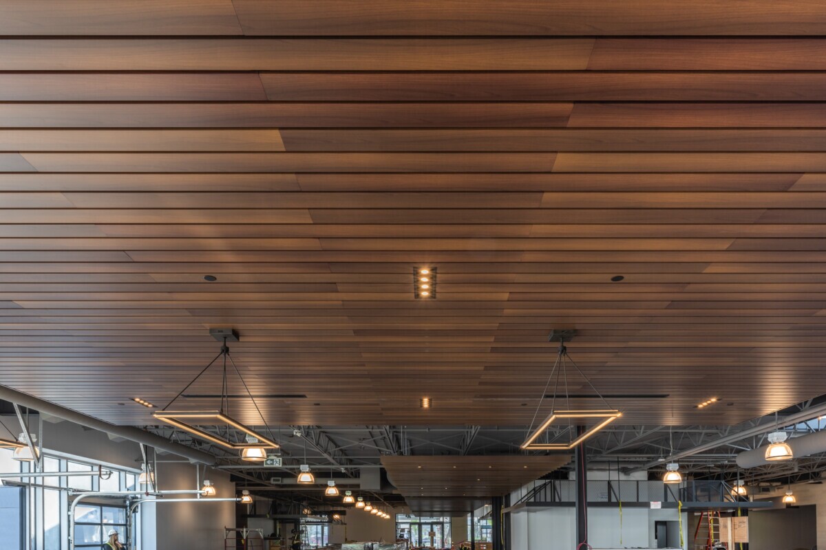 Maxxit collaborated with Dialog to expand and update this high profile shopping area. With Calgary being a growing metropolis, places to shop, dine and relax are in high demand. This new and improved destination promises to attract customers with an upscale feel that is accomplished with contemporary design and fine finishes. Focusing on the food court, Maxxit contributed in the ceiling elements. The LINE:Form Linear Planks and LINE:Form Traditional Baffles have a woodgrain vinyl finish that ties in with multiple architectural elements and creates a sense of warmth within the space.