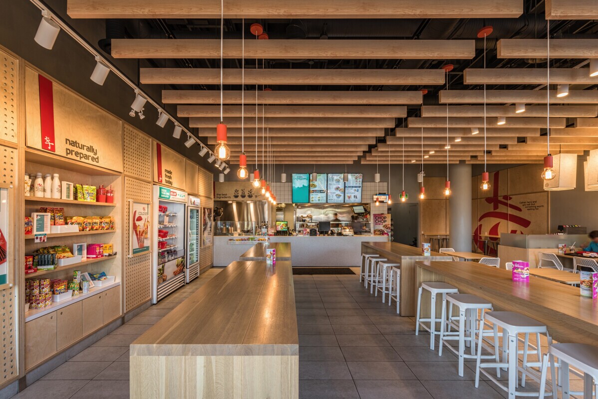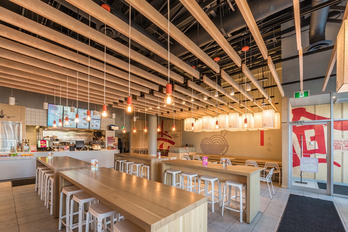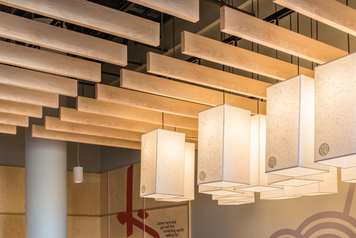 Edo Japan selected the LINE:Form Traditional Baffle system as a standard for their new and renovated stores for its eye-catching appearance. These baffles are a smaller aluminum profile which are lightweight and easy to install. The system requires an upper suspension rail secured to the ceiling and is mounted using a Soffit connector fitting.