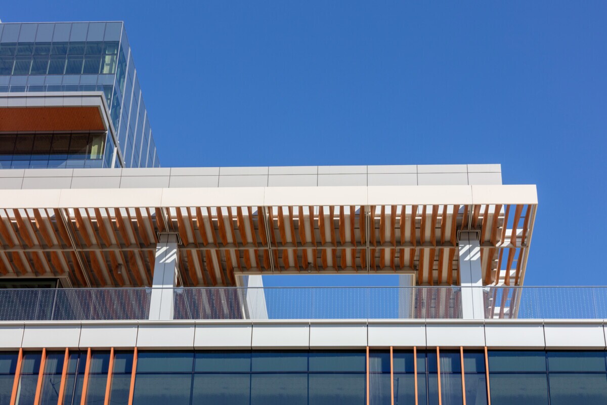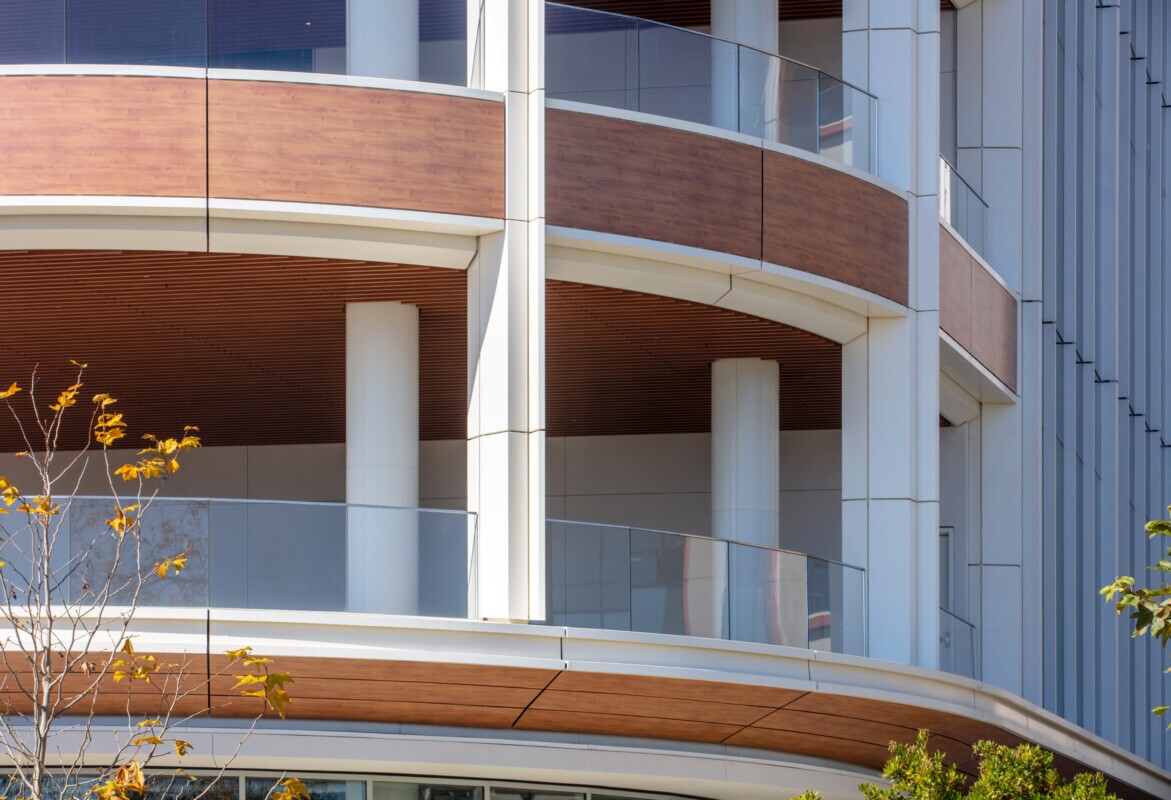 - Edge: Custom balcony façade panels finished in a high-performance woodgrain powdercoat, adding warmth and texture to the building’s exterior.