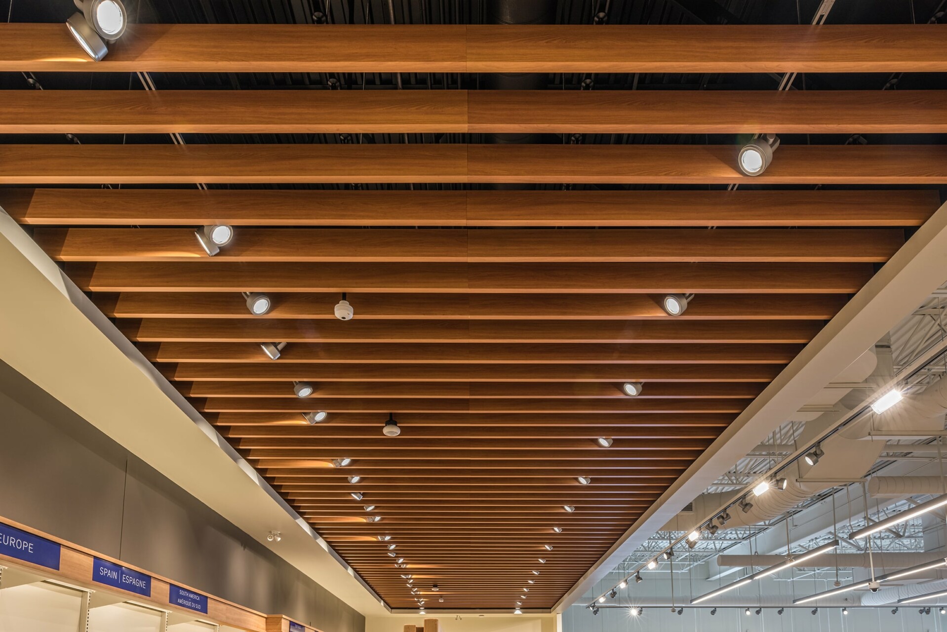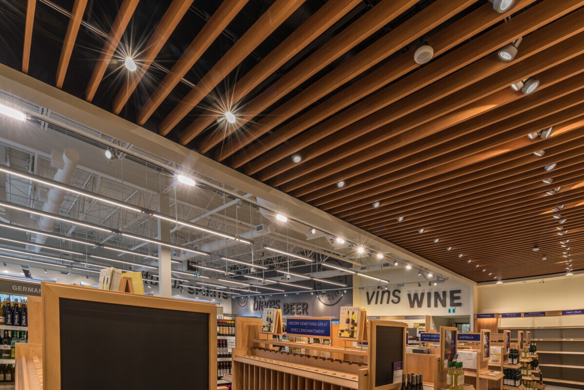 The LCBO used our LINE:Form Traditional Extruded Baffles in select locations. The lightweight ceiling system consisted of 1-1/2″ x 6″ baffles, finished with a wood grain infused coating. The baffles were mounted with an upper suspension rail and made of aluminum, non-combustible materials.