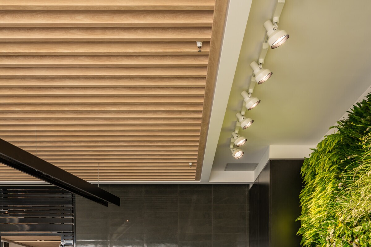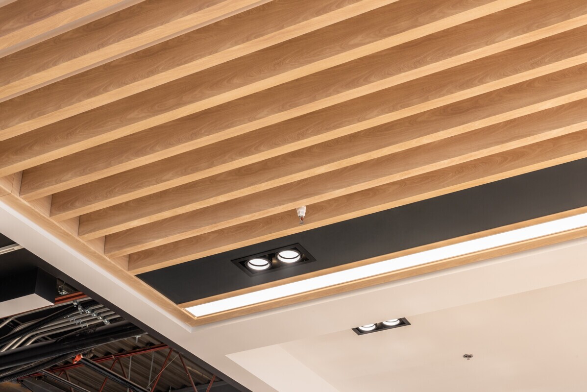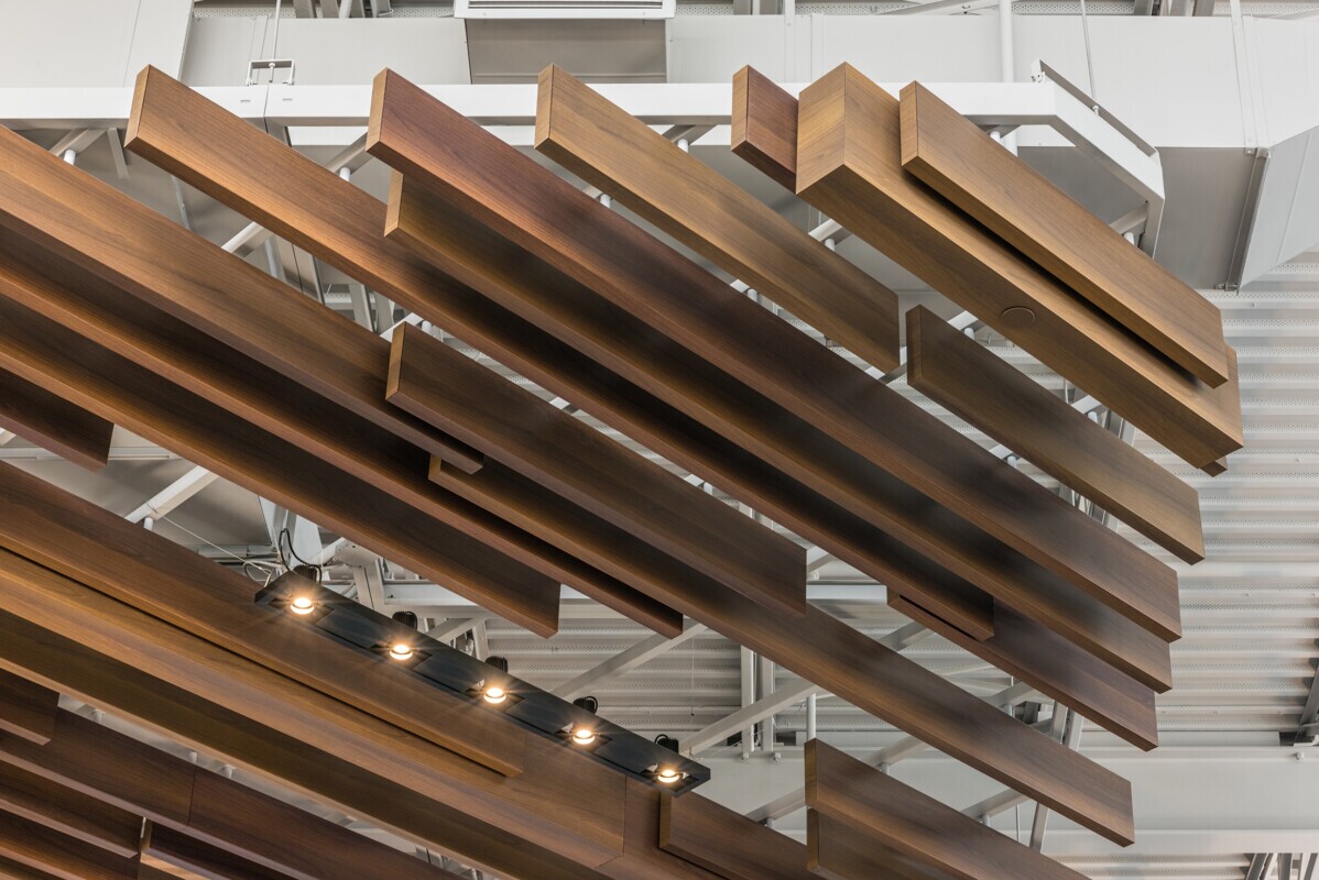 The lower LINE:Form Traditional Extruded Baffle ceiling uses a special rail system mounted to bulkheads to accommodate the baffles. This meant that the ceiling above was not required to hold the baffles; they were only mounted to the walls. Baffles were extrusions, and the longest length was 17’ of uninterrupted span.
