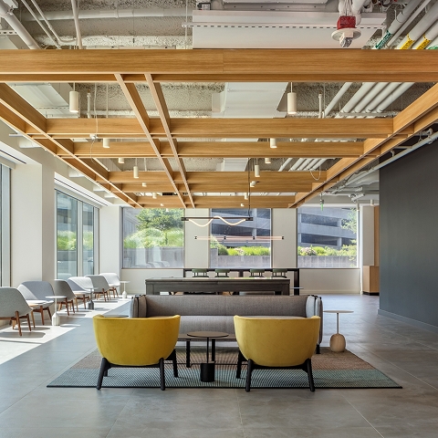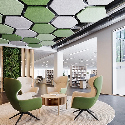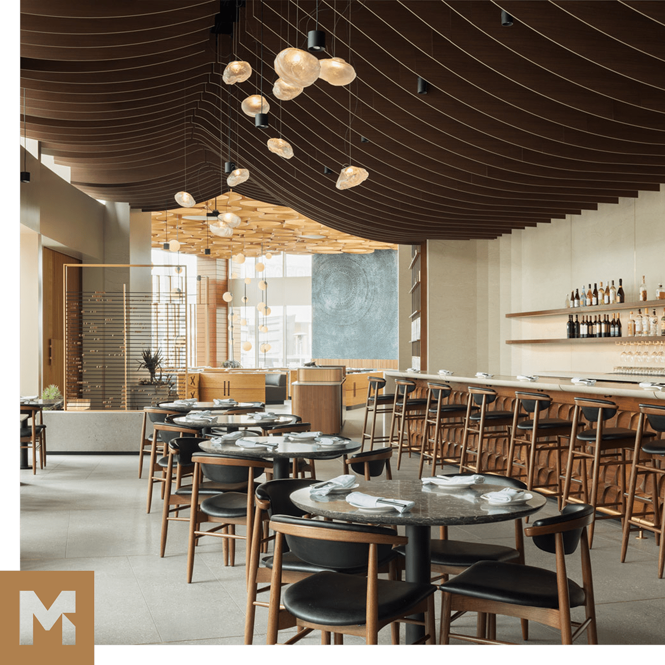 Our AERO:Form Cube Extruded Open Cell take center stage in the “Park Social Games” area, where the alternating pattern and neutral tone harmonize effortlessly with the vibrant surroundings, creating a dynamic and inviting atmosphere for guests to enjoy a variety of activity options. Likewise, at the “Corona Rooftop Patio Bar,” the sleek integration of custom ceiling-to-wall slats coupled with the traditional look of the warm wood creates a comfortable and enjoyable environment for patrons.