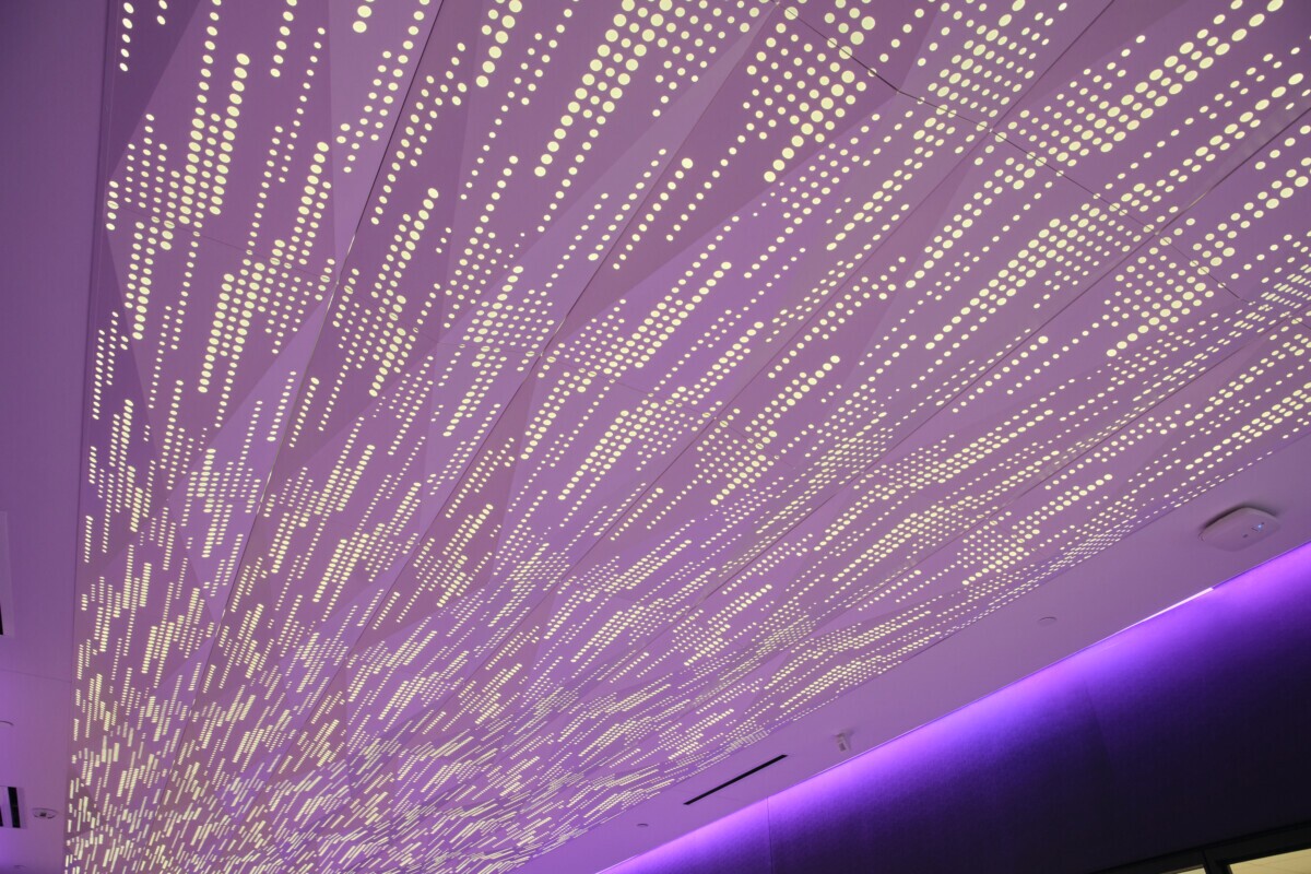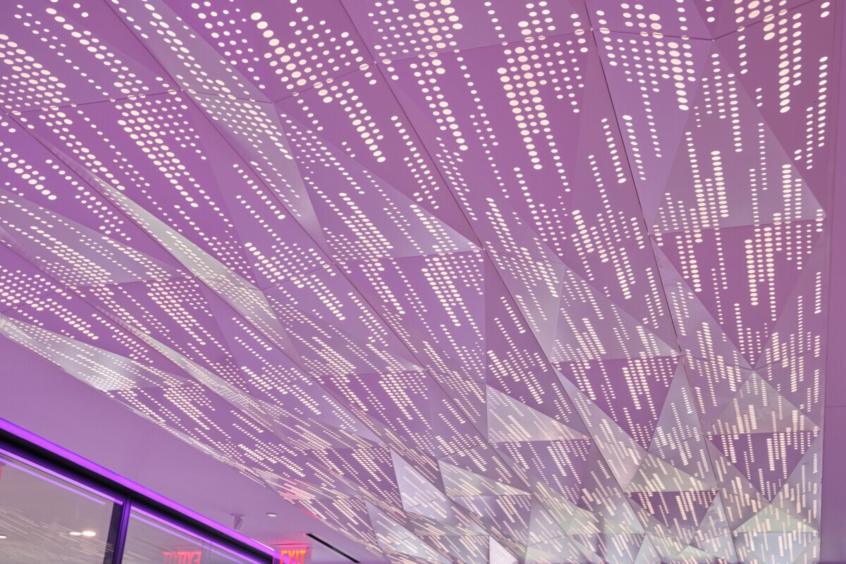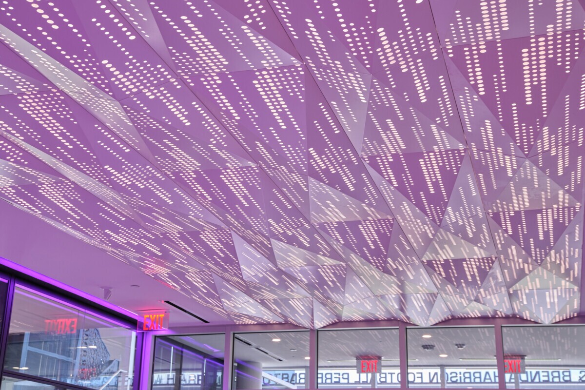 That’s where Maxxit came in. Using our PANEL:Form Dimensional Panels, we created a bold, faceted 3D ceiling system that commands attention and transforms the corridor space. The ceiling is further amplified through acoustic perforations and integrated backlighting, adding depth and visual impact. Along the edges, purple accent lighting highlights the panels, celebrating TCU’s iconic school colors and pride.
