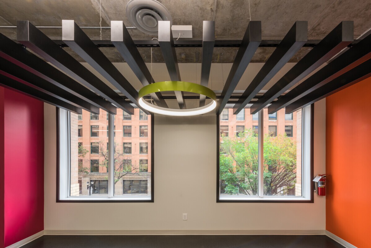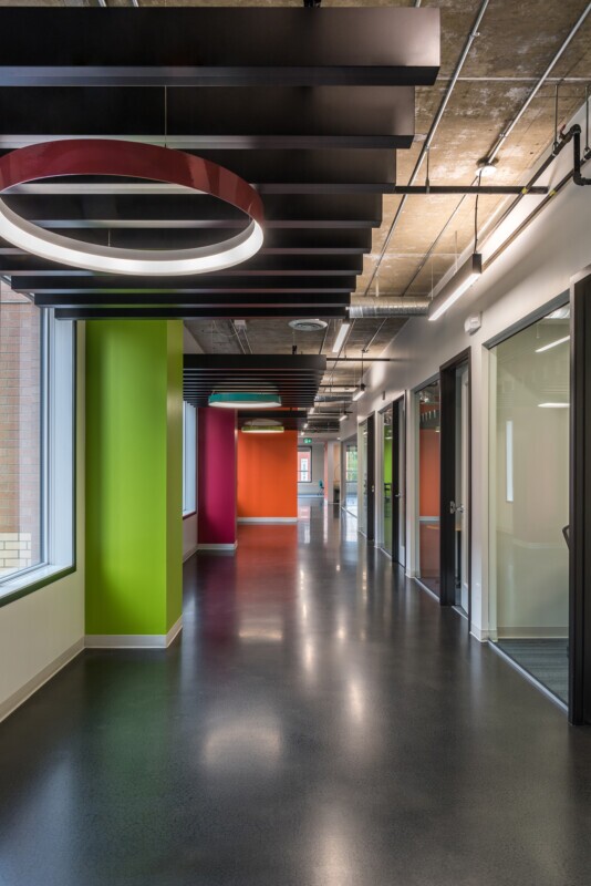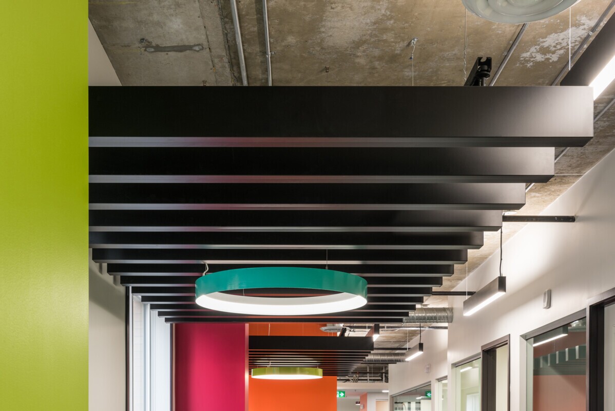 Toombs Offices in Edmonton used our LINE:Form Traditional Baffles. This was designed for easy installation and was created out of a lightweight material. To finish the look, they were powder coated black, creating a nice contrast from the colourful walls and drawing attention to the ceiling.