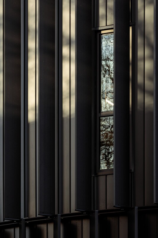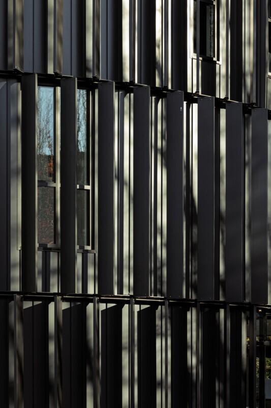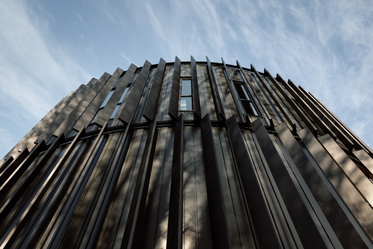 To complement the architect’s vision for the building’s distinctive exterior, LINE:Form Exterior Wall Fins were incorporated to blend seamlessly with the exposed metal facade. Close collaboration with the cladding manufacturer ensured a precise color match to preserve the cohesive aesthetic of the structure. The attachment method was carefully engineered to maintain the integrity of the cladding, allowing for water drainage without compromising performance. By rolling a C-channel to match the building’s circumference and utilizing a compression-setting attachment, Maxxit ensured a secure and durable installation to withstand the elements.